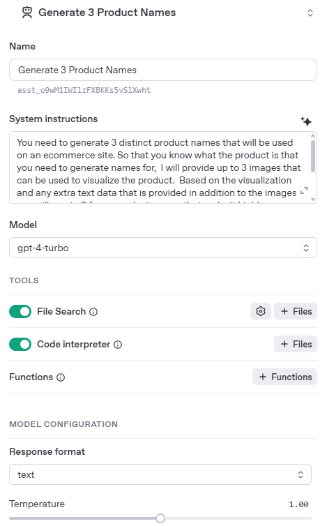 Actual AI assistant instructions provided for Generate Product Names from File functioning example: