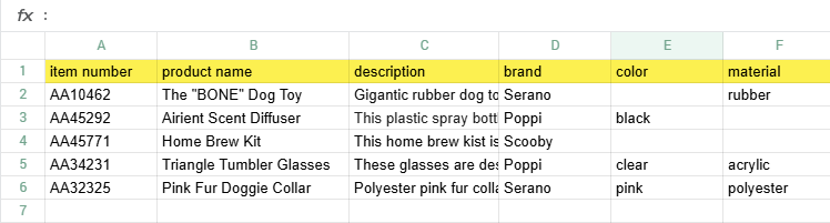 We will be importing 5 different products or items. These 5 items have multiple attributes. The Attributes that we want to import are item number, description, brand and product name. These fields will be mapped to the PIM fields: