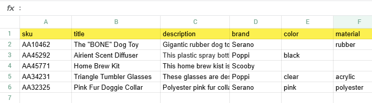 changed the value in row 1 column A to "sku" because this column contains the unique product number for each item and we want that data inserted into the "sku" attribute. We want to demonstrate that the PIM can automatically identify that the column contains the SKU based on the value in Row 1.