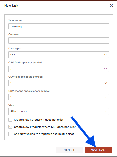 Lets proceed with the import steps. I have made all of my selections and I am ready to move on to the next step by clicking on the "SAVE TASK" button highlighted by the blue arrow below:
