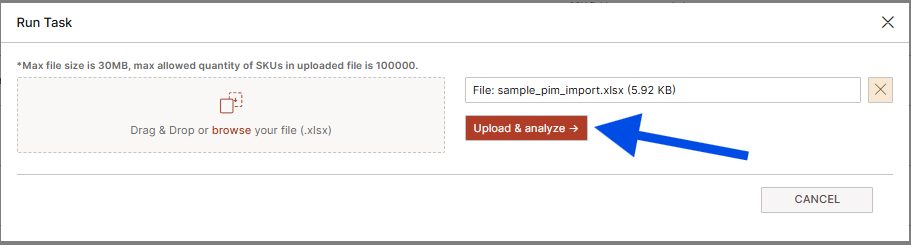 RUN actually open a window where you can drag and drop your file onto the drop zone highlighted by the blue arrow in the image below, or select your file by clicking on "browse" (highlighted by the red arrow) so that the file can be Analyzed for import.