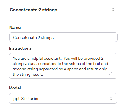 A OpenAI assistant AI assistant is configured to perform a string concatenate, or combining two separate attribute string values together strings together for insertion into a third attribute's data value.