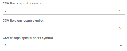 You must select this value. The data type denotes the type of file that is expected by the import job. The file may be posted to a predefined import job URL, selected using a file selection dialog or dropped onto the upload area in the browser. The file type used as a sample is a .CSV file. Your file may be a .CSV or other format. When you select .CSV format you are presented with additional choices: ![]() The selections above are the default values. The values that your file format require may be different. If you have no idea what to select you can always send a copy of your file to our support team or schedule a support meeting by contacting us. We are always ready to help you. |