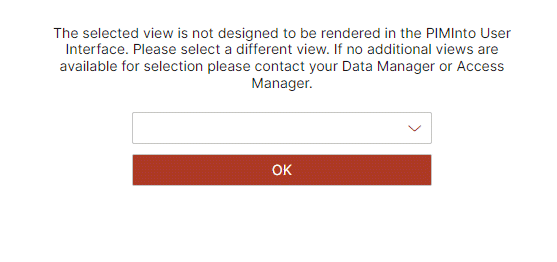The PIM interface requires that specific attribute data is available in order for the user interface to be rendered properly. Views that apply restrictions to these attributes will not be able to be properly rendered. In this a case an informational message will be displayed in the user interface and a different View can be selected.