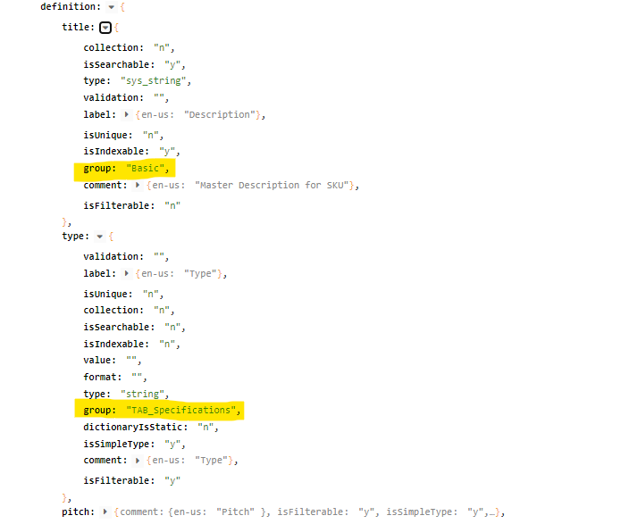The Attribute's "group" information is returned in the product related API requests. This allows classification or grouping of API data. In the Brand Portals the data will be grouped in the appropriate details "TAB." In custom headless e-commerce implementations, developers and integrators have used this feature to make hiding, showing and grouping of product data easier and dynamic.